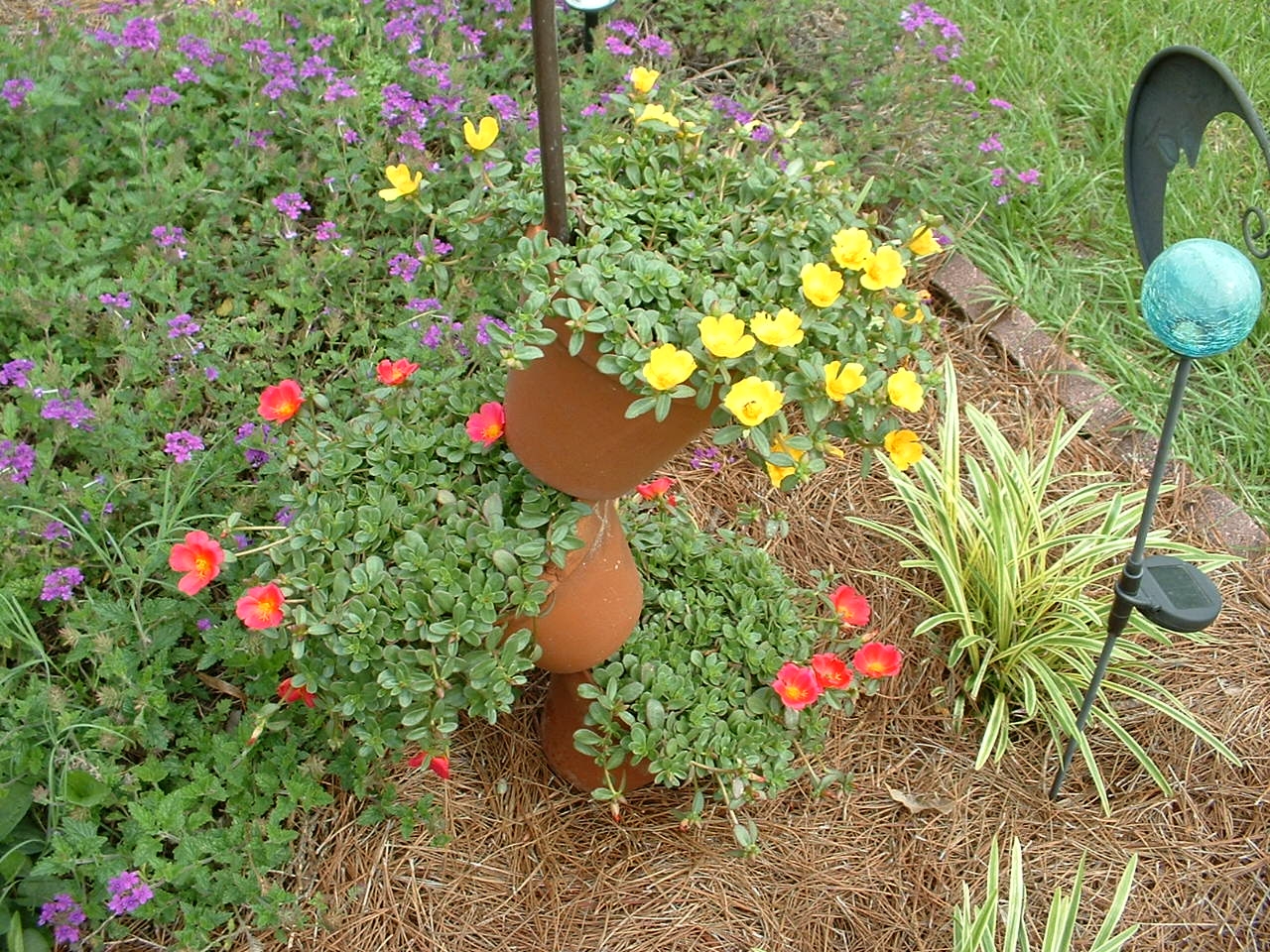 Several years ago Sharon bought a plant stand for me. It consists of copper legs and an upright copper post that holds three 8″ pots as you see here. I tried different types of flowers for a few years but nothing worked to my satisfaction until I tried Purslane. It fills the pots and flows down the sides – and it covered with flowers most of the time (this picture is early in the season – see the one below).